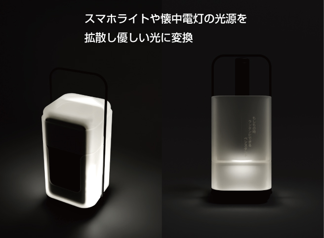 スマホスタンド部分とスマホライトを活用し光を優しく拡散できる簡易ランタンとして利用が可能。