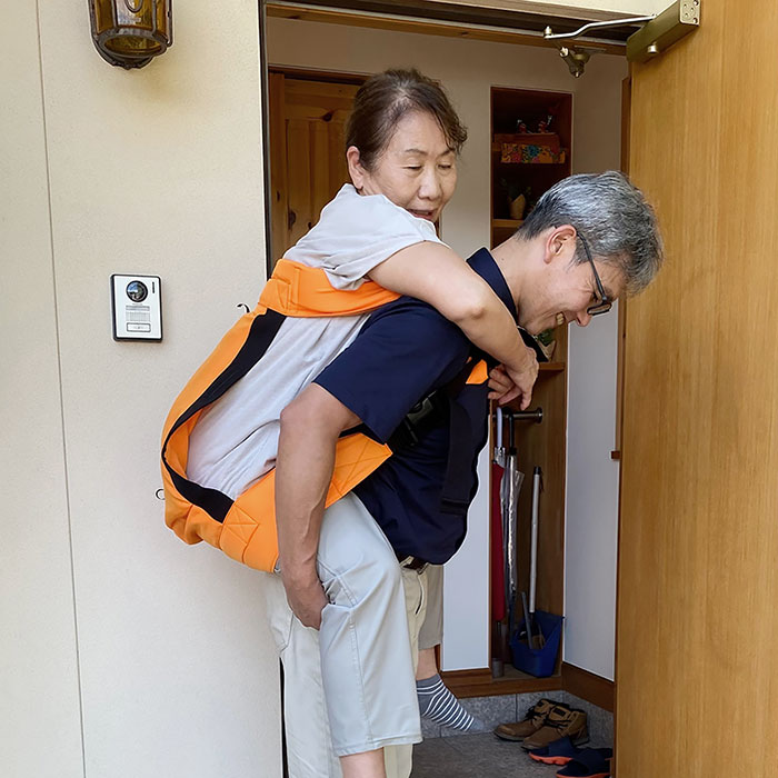 通常時はインテリアとして使用できるクッションですが、ひっくり返して広げることで、介助帯や担架として機能し、災害時や緊急時には大人が大人(子供)を安全に運ぶことができます。