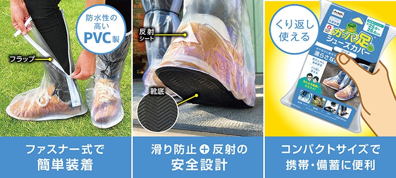 大雨や災害時でも利用可能で、接合部は糸を使わず熱溶着されており、フラップ付きのチャックが水の浸透を防止。さらに、かかと部分に反射シートが付いているため、夜間の安全性も確保できます。