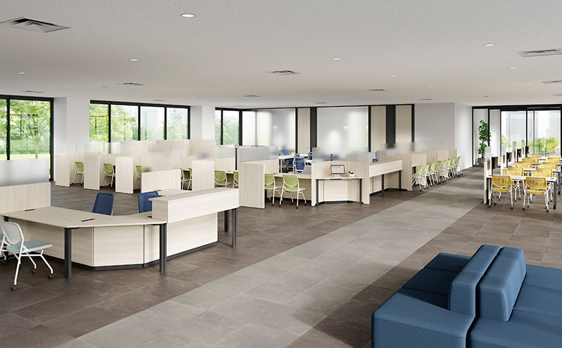 様々なカウンター形状からテーブル使いまで変形可能な窓口スペース用什器です。