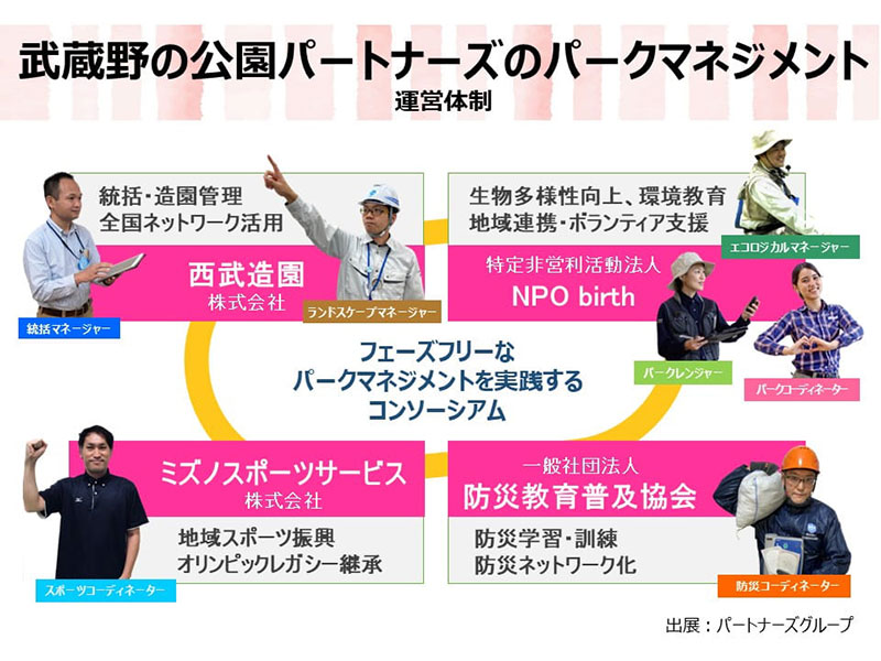 構成団体:西武造園株式会社、特定非営利活動法人 NPObirth、ミズノスポーツサービス株式会社、一般社団法人防災教育普及協会- 都立武蔵野公園